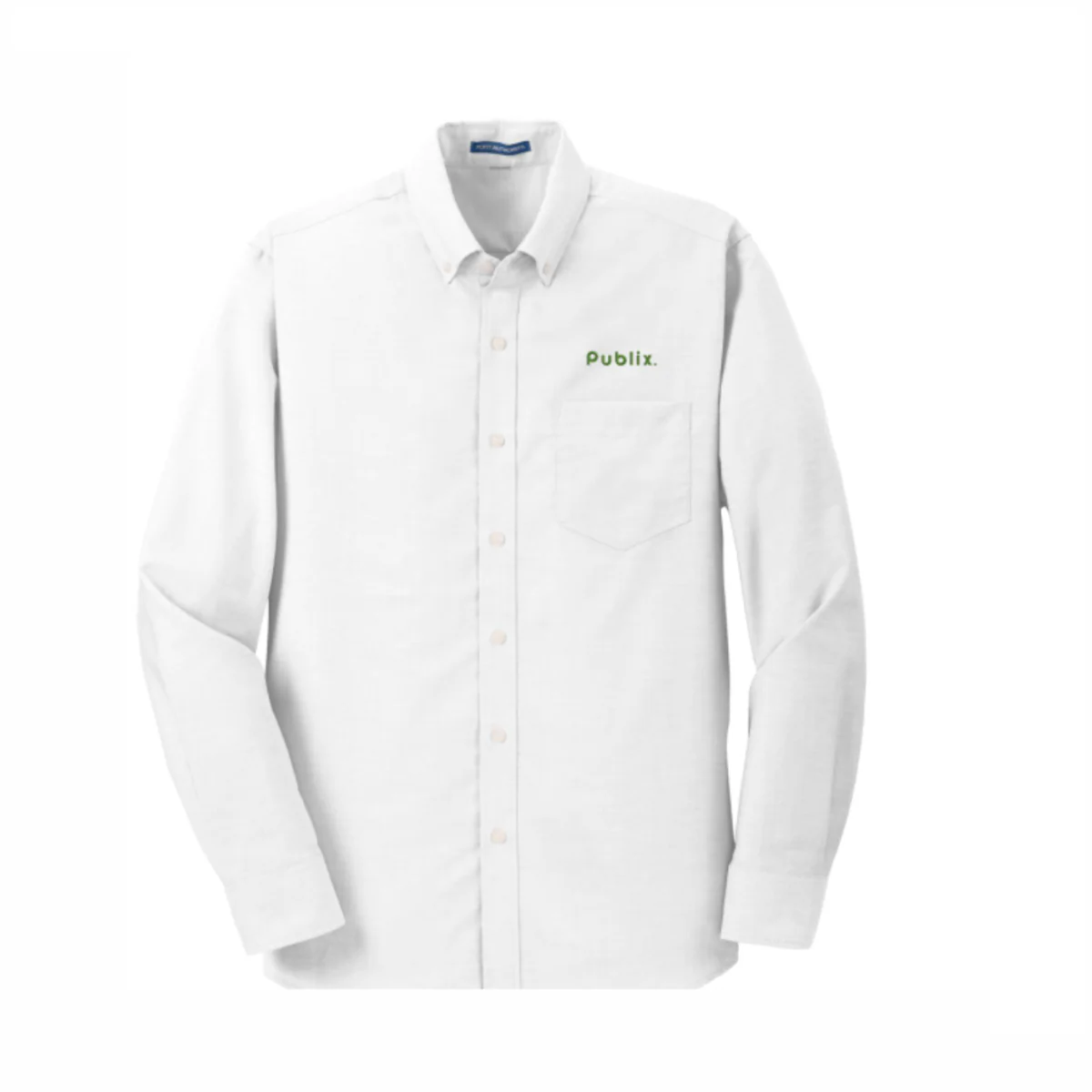 Look your best in a tried-and-true oxford that performs. Proven in independent lab tests to resist and release stains, our SuperPro Oxford has a soft hand and a wrinkle-free finish to keep you looking neat and professional all day long. 4.6-ounce, 60/40 cotton/poly, back yoke with knife pleats, button-down collar, left chest pocket, button-through sleeve plackets, and two-button adjustable cuffs. Oxford Blue with Publix logotype on left chest.
